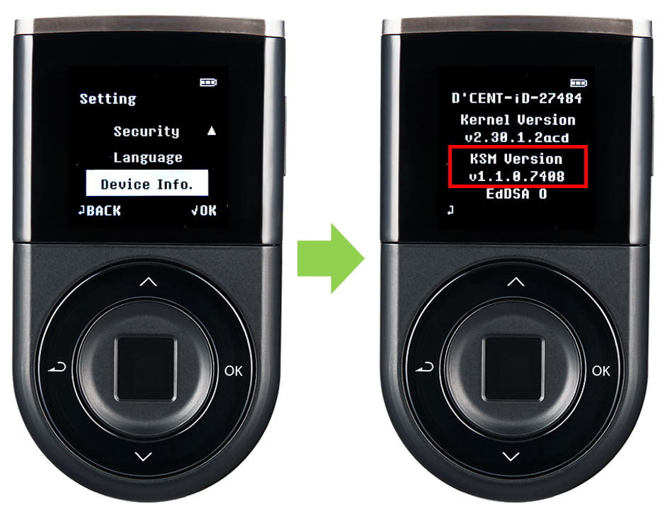 To use the passphrase feature, the D’CENT Biometric Wallet device must have a security chipset with **KSM version 1.1 or higher**. An older model of the Biometric wallet with the KSM version below the requirement does not support the passphrase feature.