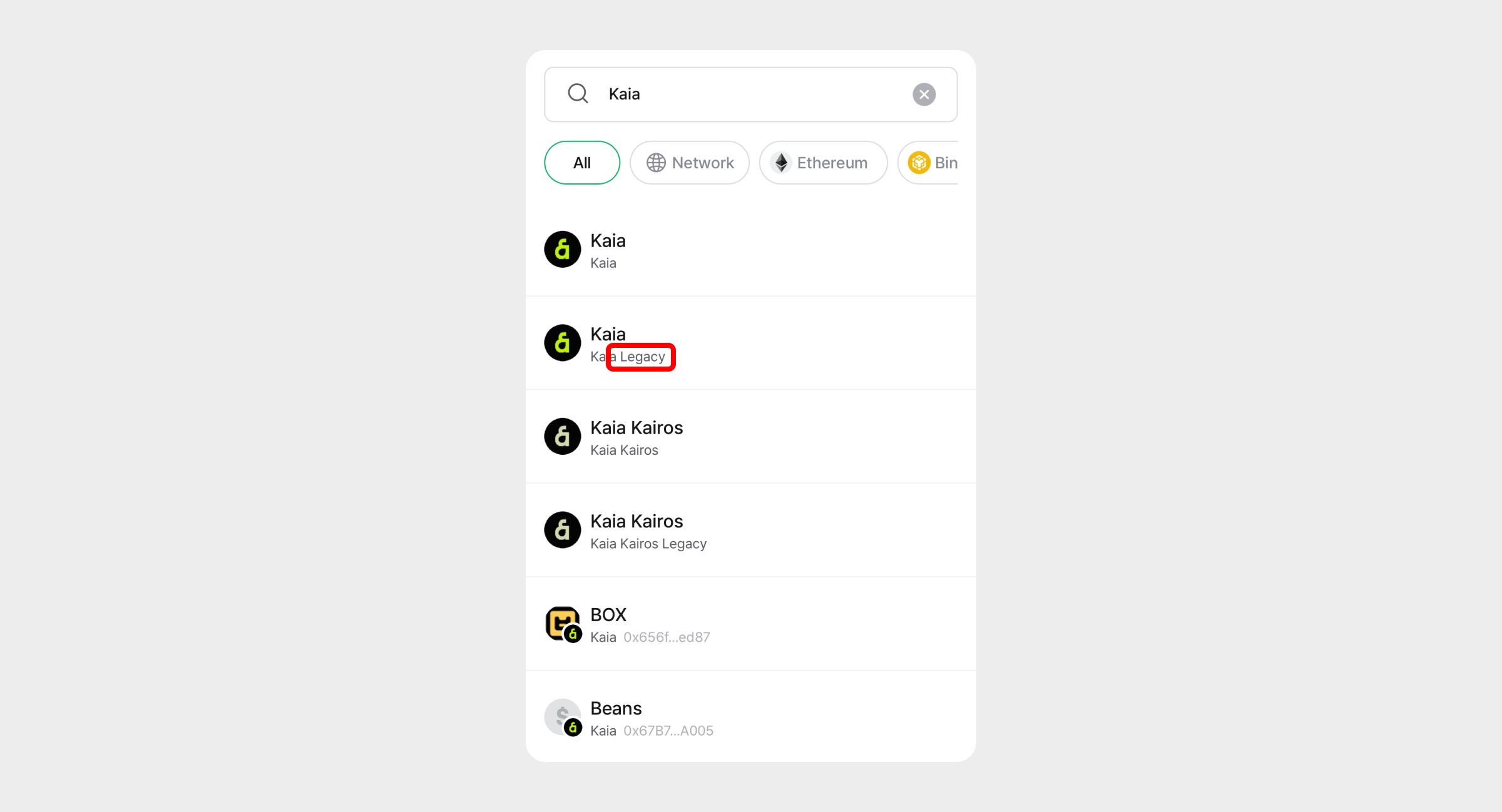 **2)** **「アカウント追加`+`」**&#x30DC;タンをタップし、リスト上か&#x3089;**「Legacy」**&#x3068;表示されているアカウントを選択します。(例：Kaia Legacy)