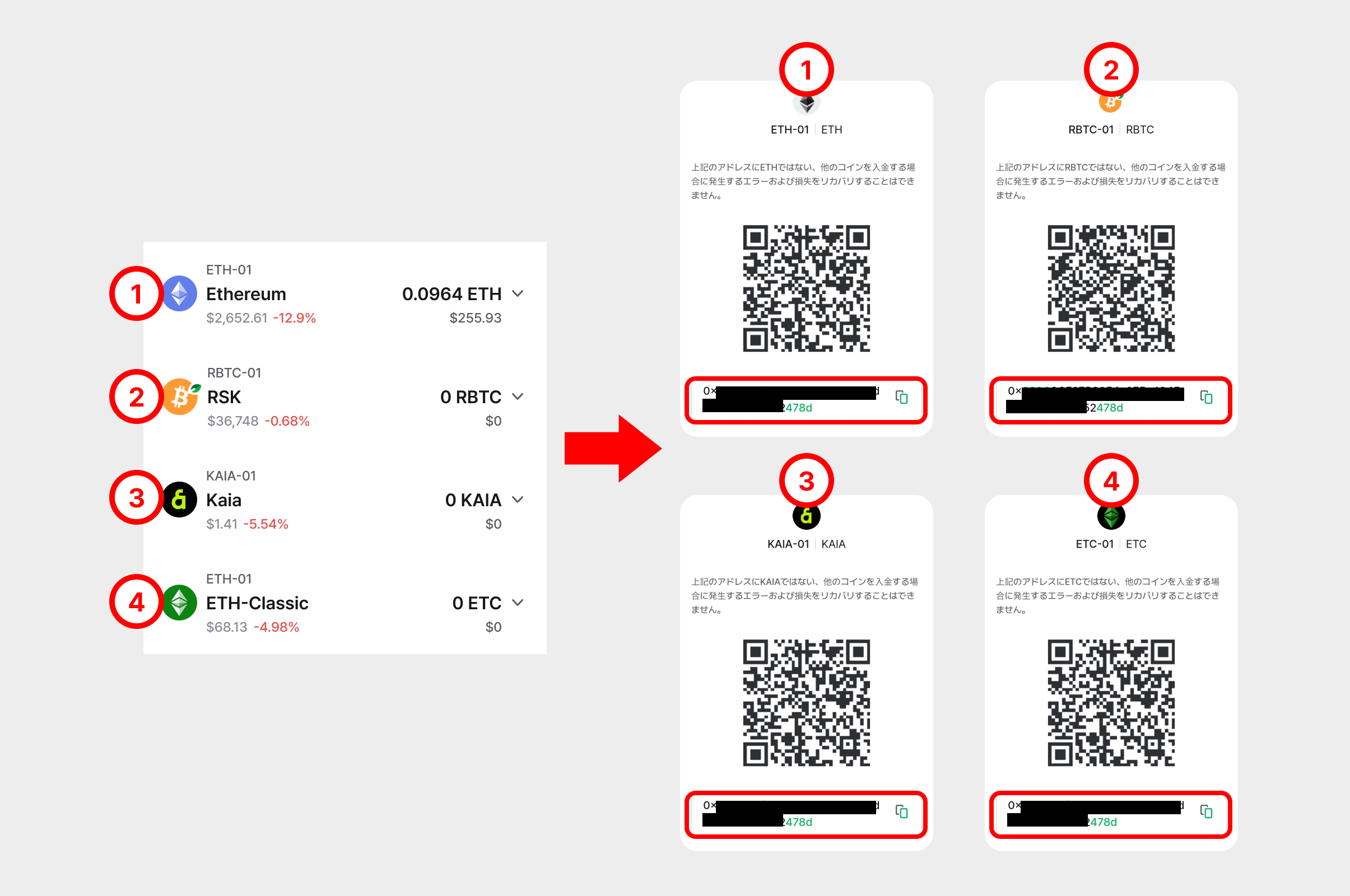 スマホ版アプリのバージョン v5.3.1 より、カイア(KAIA)、イーサリアムクラシック(ETC)、RSK(Rootstock)用に作成されたアカウントが対象に、イーサリアム用アカウントと同じアドレスで生成されるようになりました。