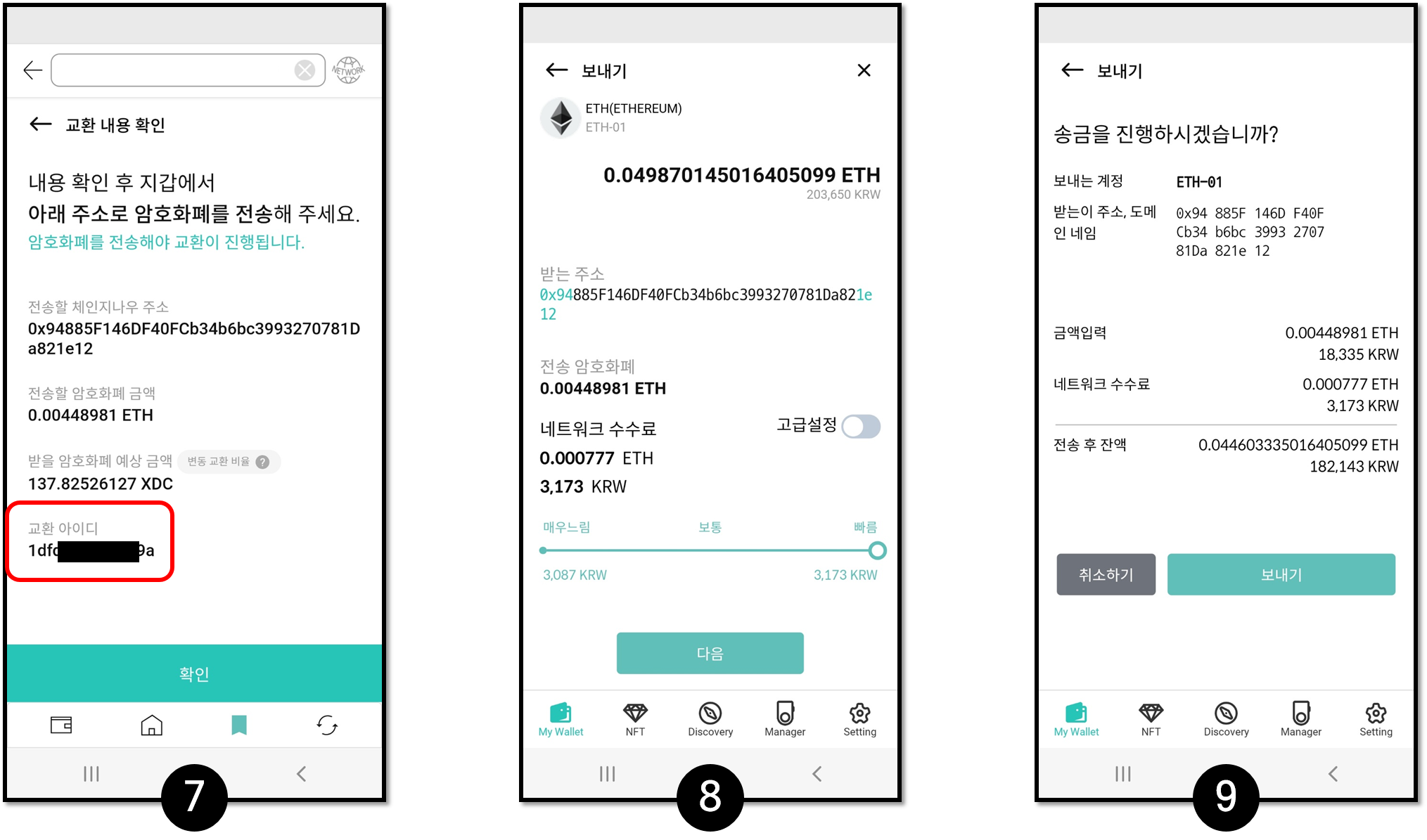 7. 교환은 귀하가 약정된 자산 금액을 교환 서비스로 이체한 경우에만 이루어집니다. 화면에서 거래내역을 확인하세요. 이 화면에서도 교환 아이디를 확인할 수 있습니다.